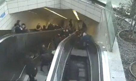A commuter has been swallowed by an escalator after it collapsed during rush hour. CCTV footage shows a stream of people walking down...